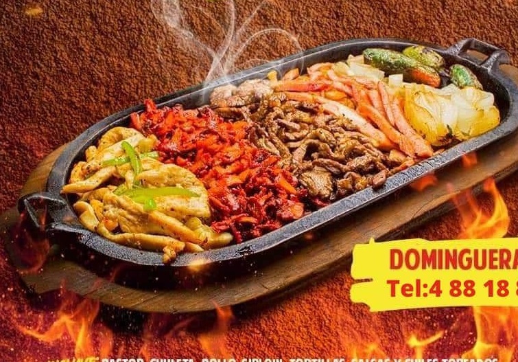 Top sirloin, costilla y pollo, frijoles charros, una salchicha, dos quesadillas, agucate, tortillas, cebolla asada y chiles toreados
