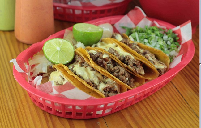 5 deliciosos tacos de carne asada en tortilla de maíz.