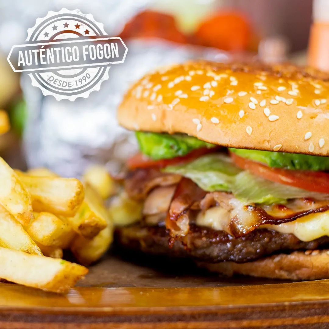 Con tocino, aguacate, carne y aguacate. Incluye papas y refresco.