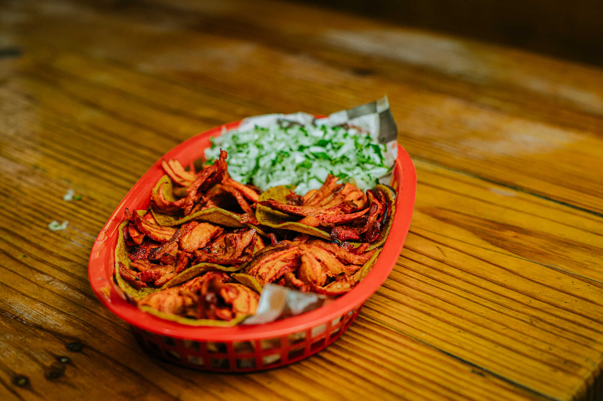 5 deliciosos tacos de pastor en tortilla de maíz.