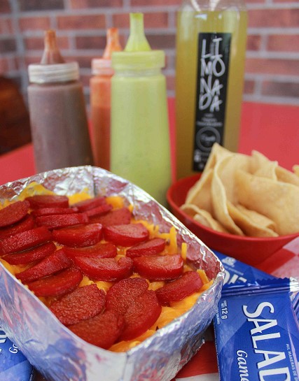 Incluye crema, mantequilla, queso amarillo, salchicha para asar y jalapeños.