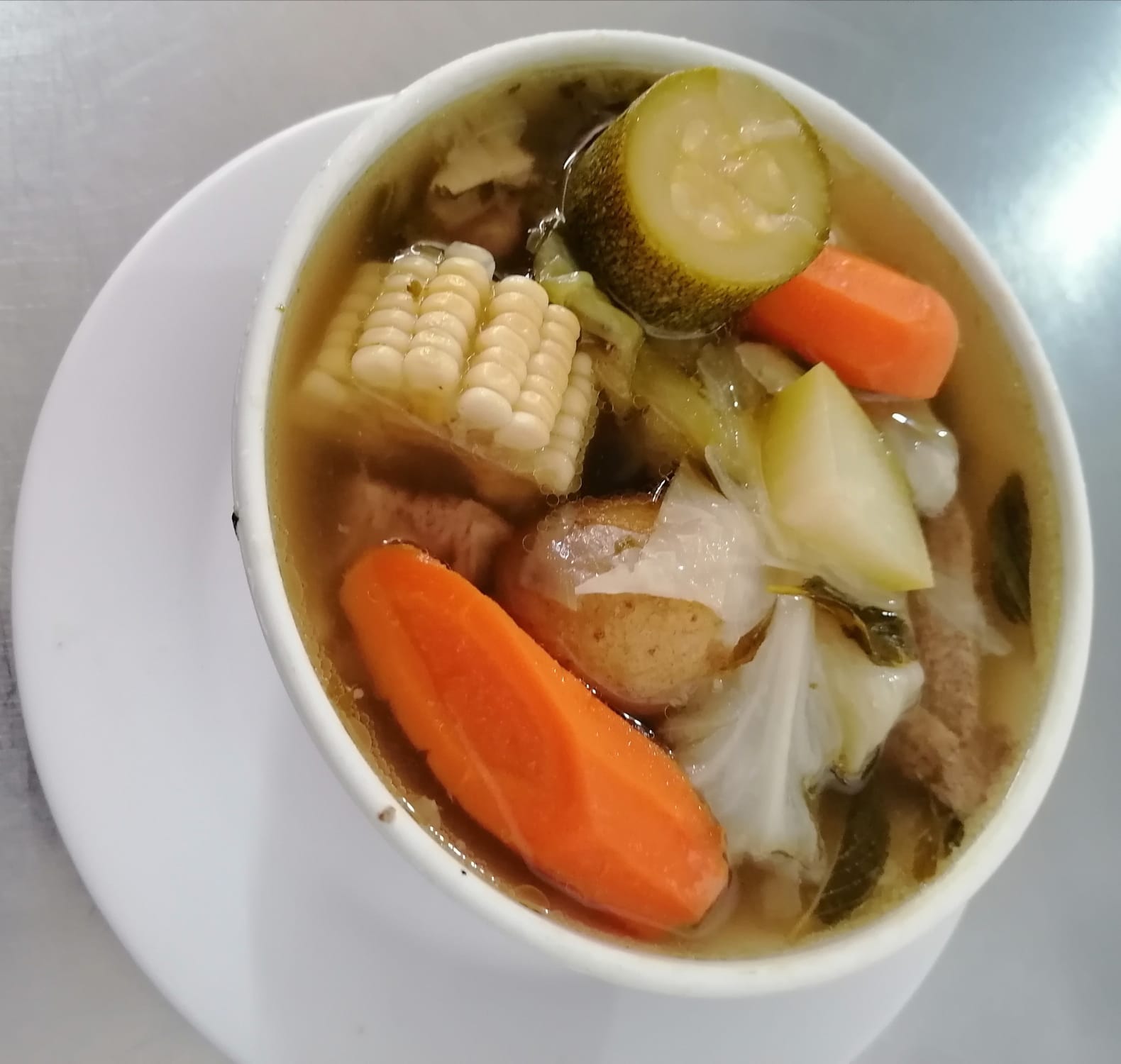 Platillo personal, máx. 2 personas: Caldo de res 1 litro con calabaza, papa, zanahoria, elote y verduras; incluye res.