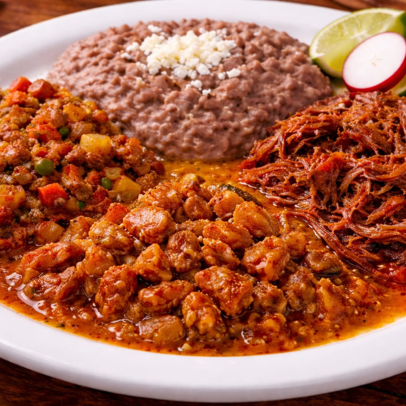 Platillo de 3 guisos a su gusto con frijoles (incluye tortillas)