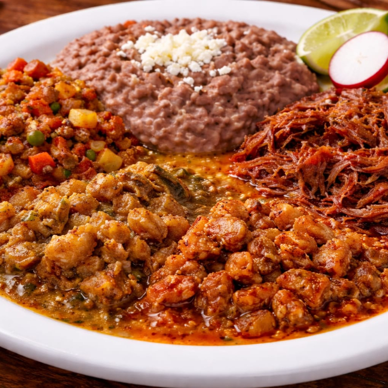 Platillo de 4 guisos a su gusto con frijoles (incluye tortillas)