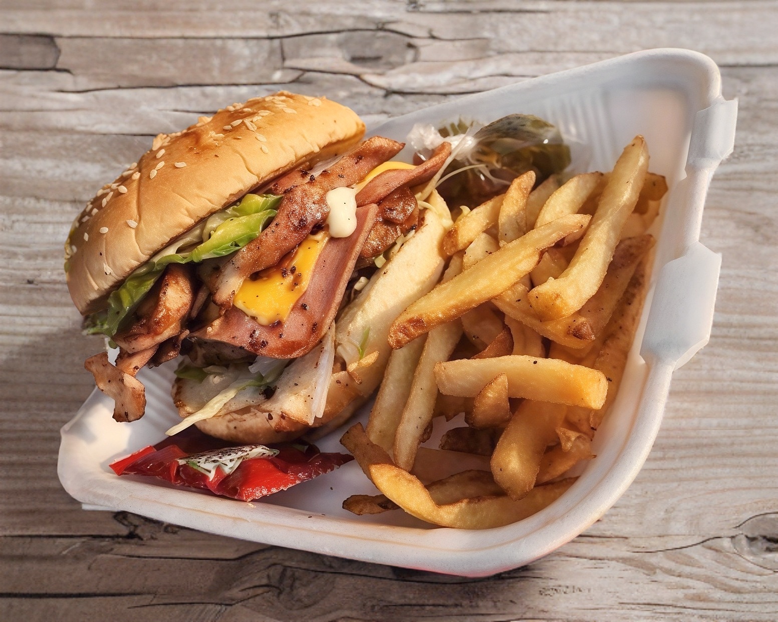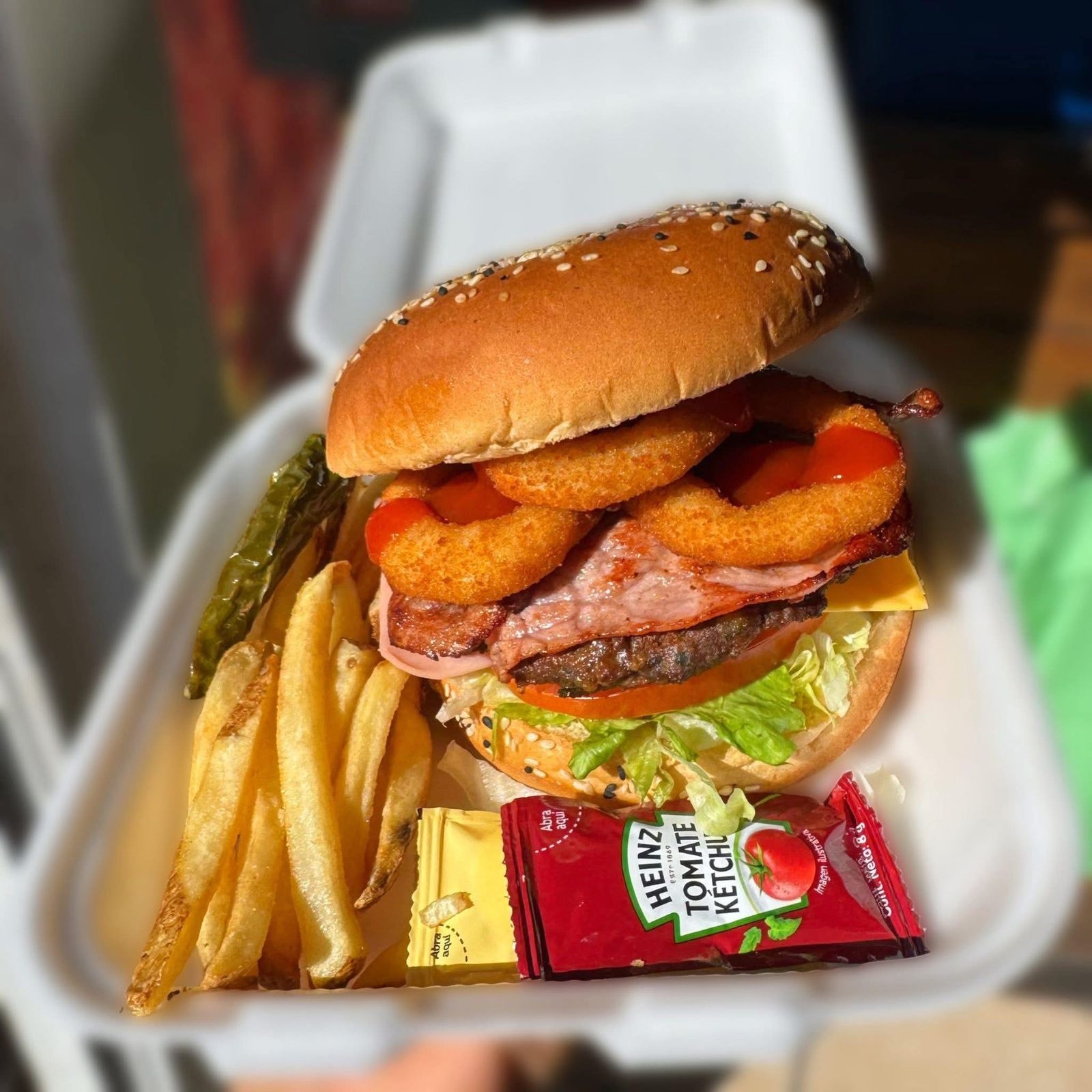 Carne de res, queso americano, 3 aros de cebolla, tocino y BBQ.