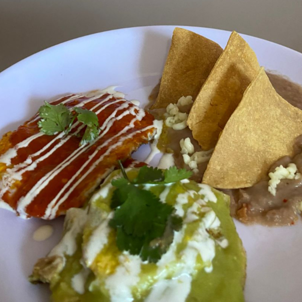 Huevos estrellados bañados en salsa roja y verde acompañados de frijoles refritos, queso fresco y totopos crujientes.