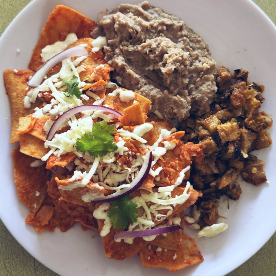 Chilaquiles verdes o rojos acompañados de frijoles refritos, servidos con el guiso de tu elección.