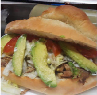 Pierna de puerco, lechuga, tomate, cebolla, aguacate, crema. Incluye papas a la francesa.