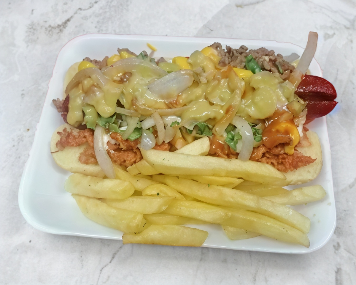 Salchicha de pavo o para asar, cebolla asada, bistec , pastor y pepinillos. Incluye papas a la francesa.