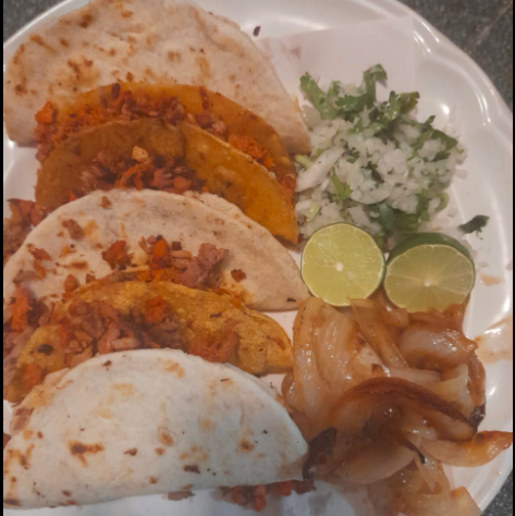 5 Tacos con carne de pastor y bistec con queso, acompañados con cilantro, cebolla, cebolla asada limones y salsas.