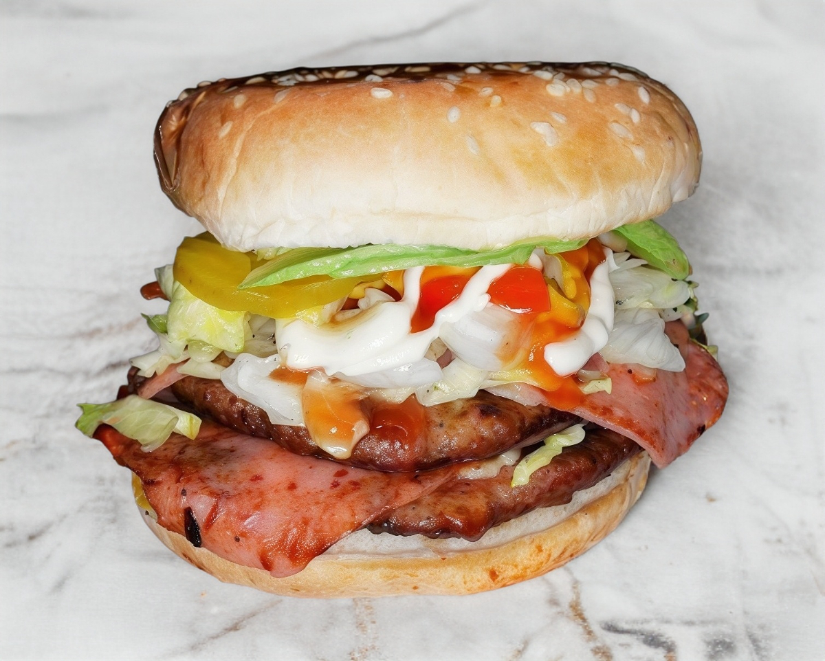 150 gr. de carne, aguacate, queso chihuahua, jamón y piña sazonada. Incluye papas a la francesa.