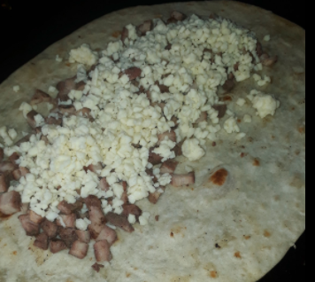 Tortilla de harina de 21 cm., con carne de pastor y bistec con queso, acompañada con cilantro, cebolla, cebolla asada limones y salsas.