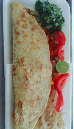 Tortilla de harina de 21 cm., con carne de bistec, y queso, acompañado de cebolla, cilantro, cebolla asada, limones y salsas.