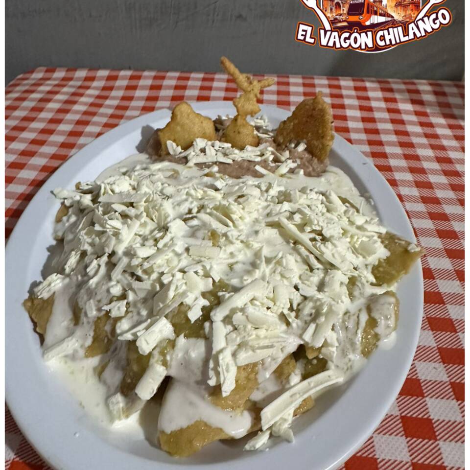 Totopos de maiz bañados en salsa verde acompañados con un huevo estrellado y cofitados con cebolla, crema, queso y cilantro