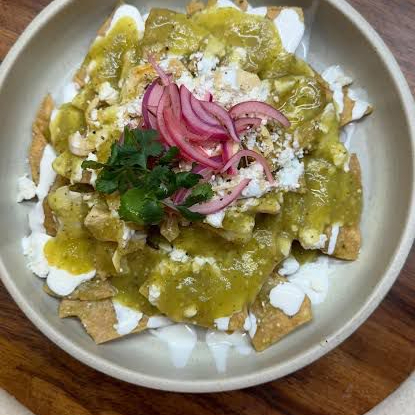 Totopos bañados en salsa verde acompañados con pollo y confitados con cebolla, crema, queso y cilantro