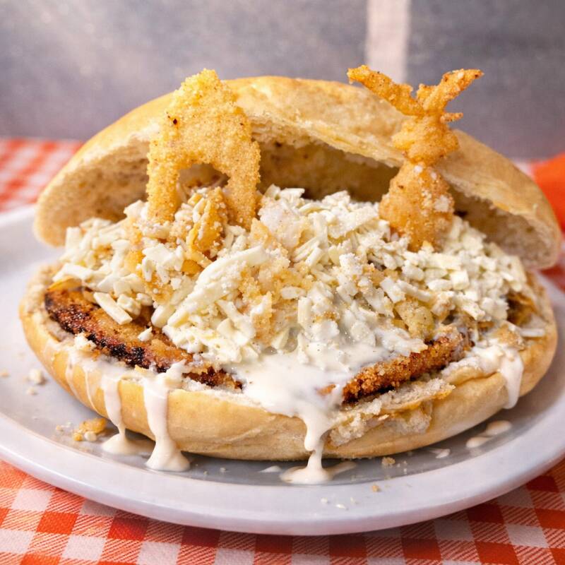 Pan de telera grande relleno de Milanesa, quesillo y Piña