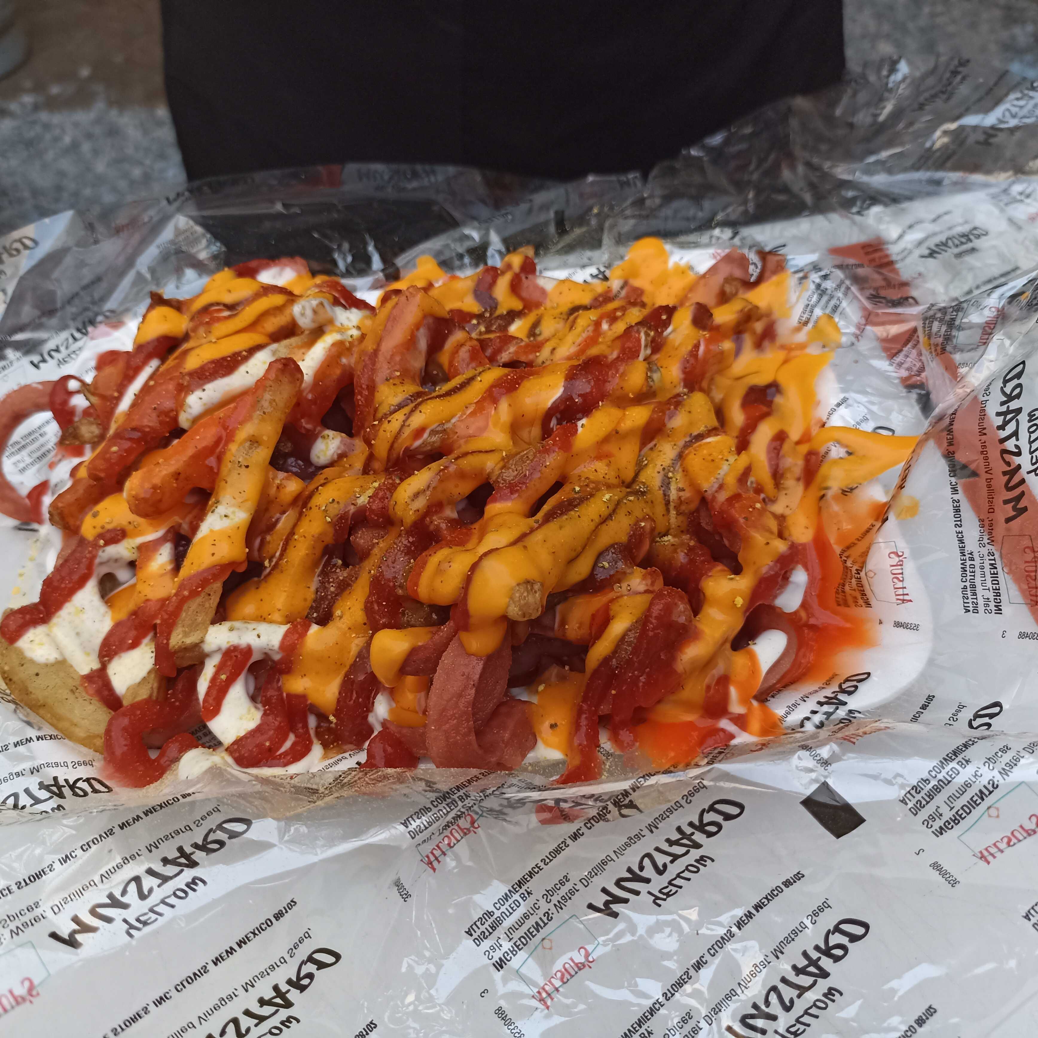 Salchicha frita en tiras, papas a la francesa, mezcla de todos los aderezos