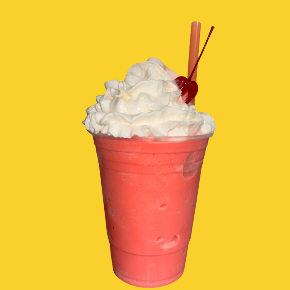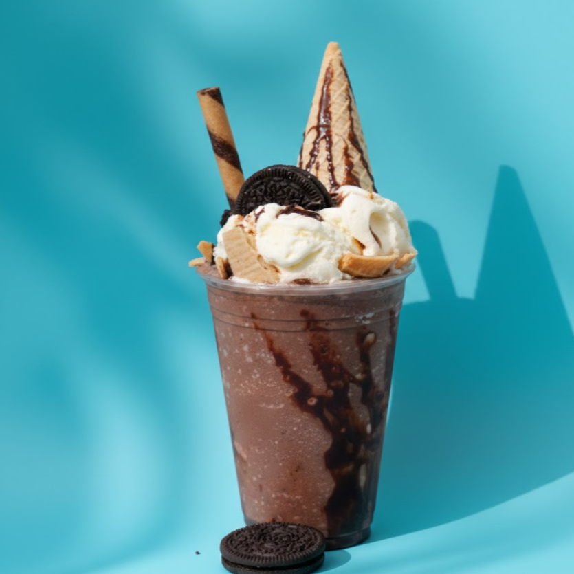 Frappé con nieve de vainilla, cono, Hershey's y galleta en forma de barquillo..