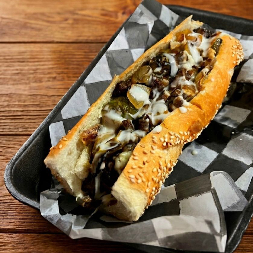 Carne de res jugosa con queso derretido y cebolla caramelizada en pan dorado, acompañado de chile toreado 🔥🌶️