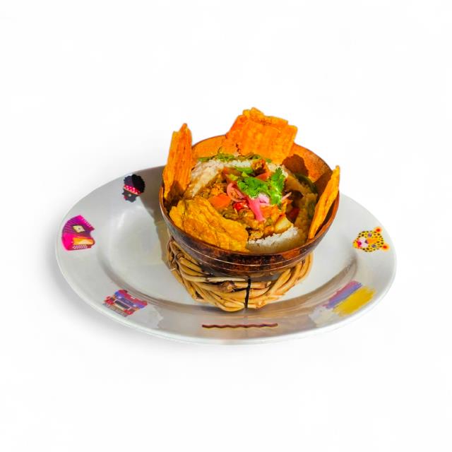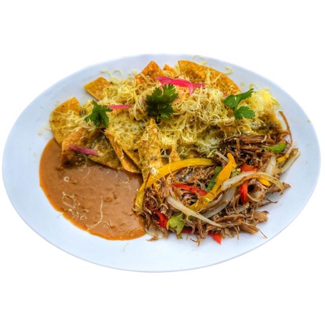 Crujientes totopos bañados en salsa, coronados con nuestra famosa carne deshebrada al estilo colombiano y queso fresco.