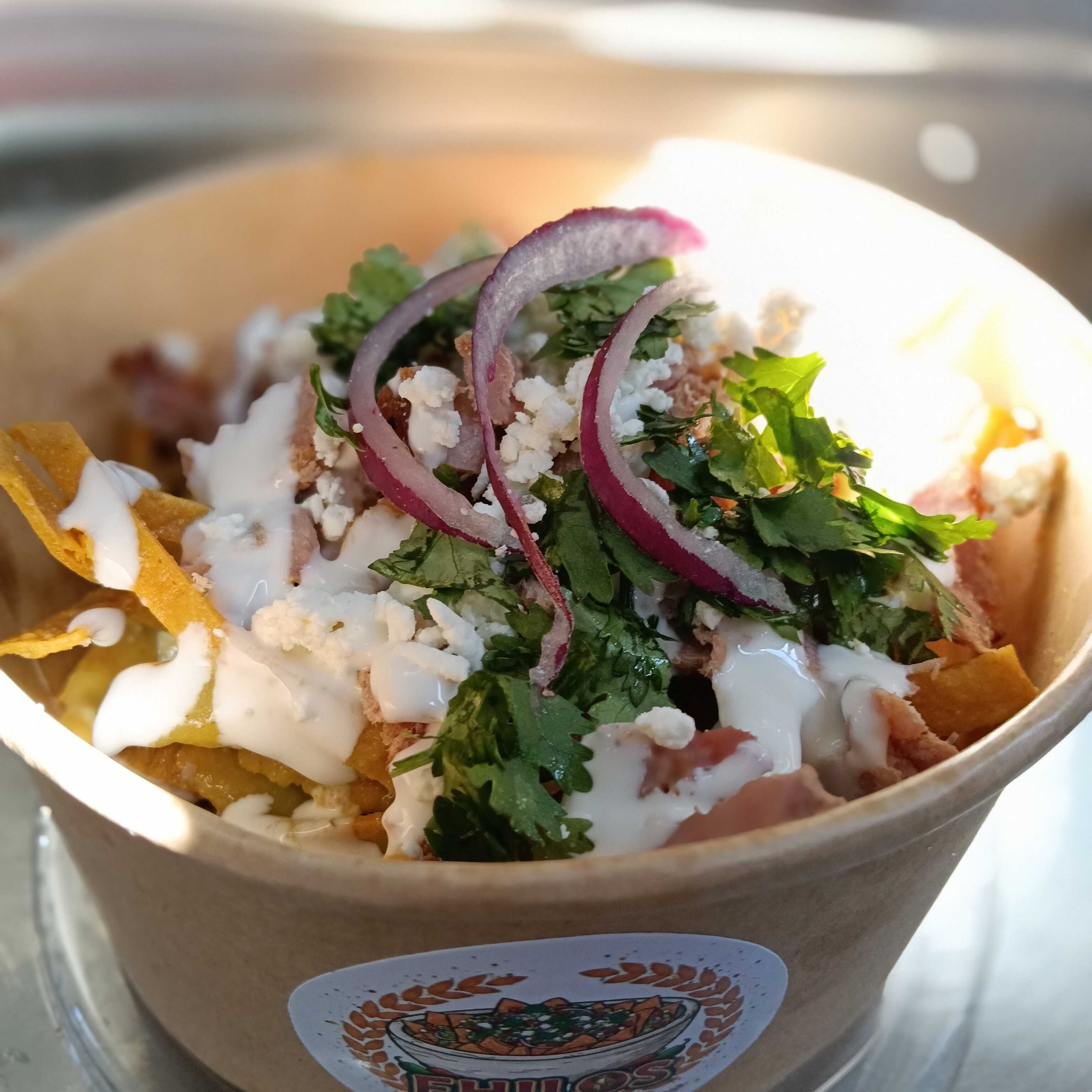 Bowl de casi medio kg de chilaquiles con base de totopos tortilla amarilla, queso fresco, crema, 150 gr de arrachera, cilantro y cebolla morada con nuestras salsas especiales