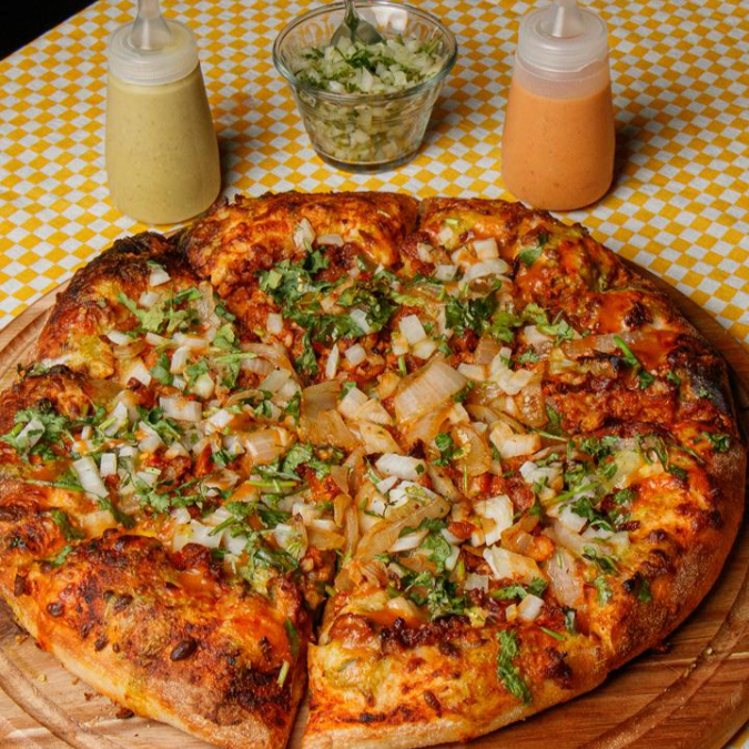 Masa delgada, mezcla de quesos, carne de pastor cebolla y cilantro rayada con salsa verde