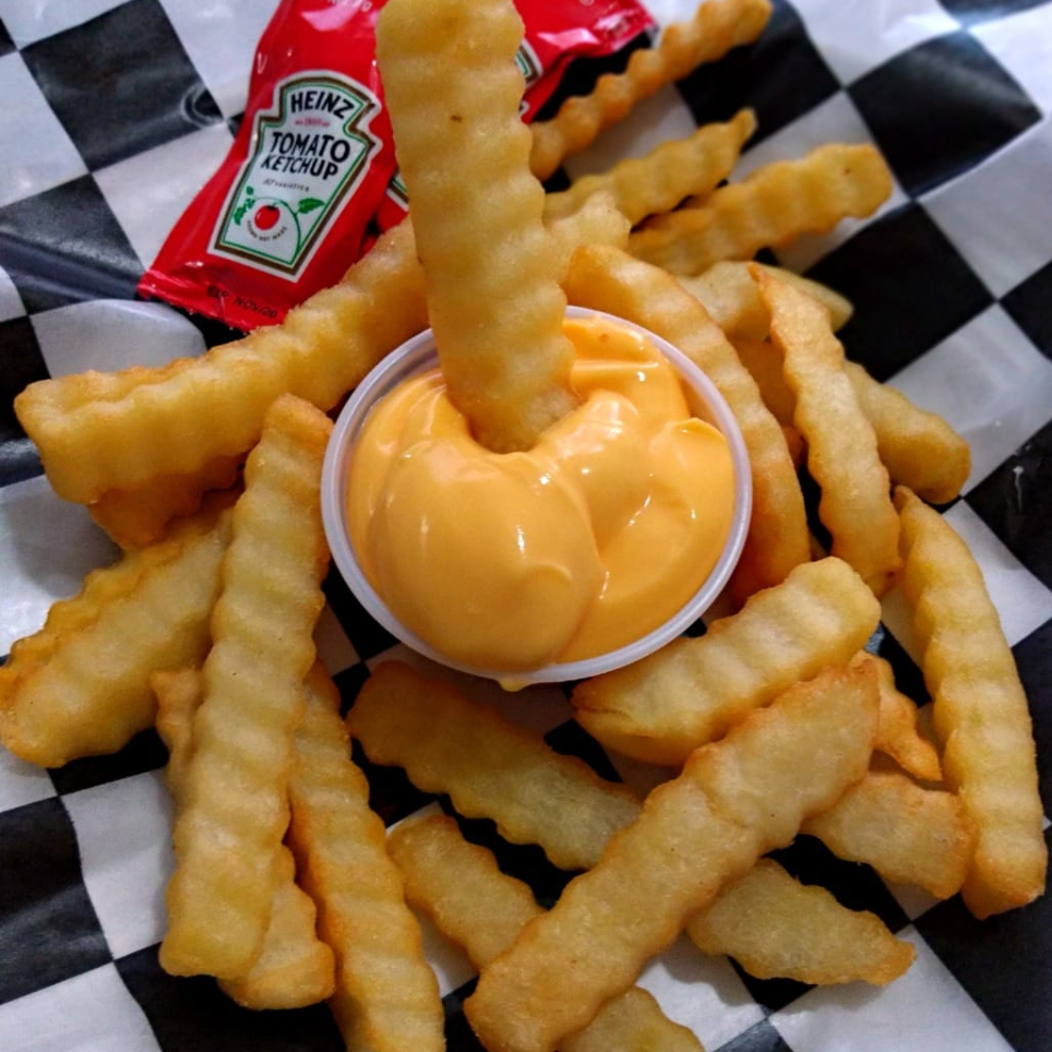 DELICIOSAS PAPAS ONDULADAS FRITAS, BAÑADAS EN QUESO AMARILLO