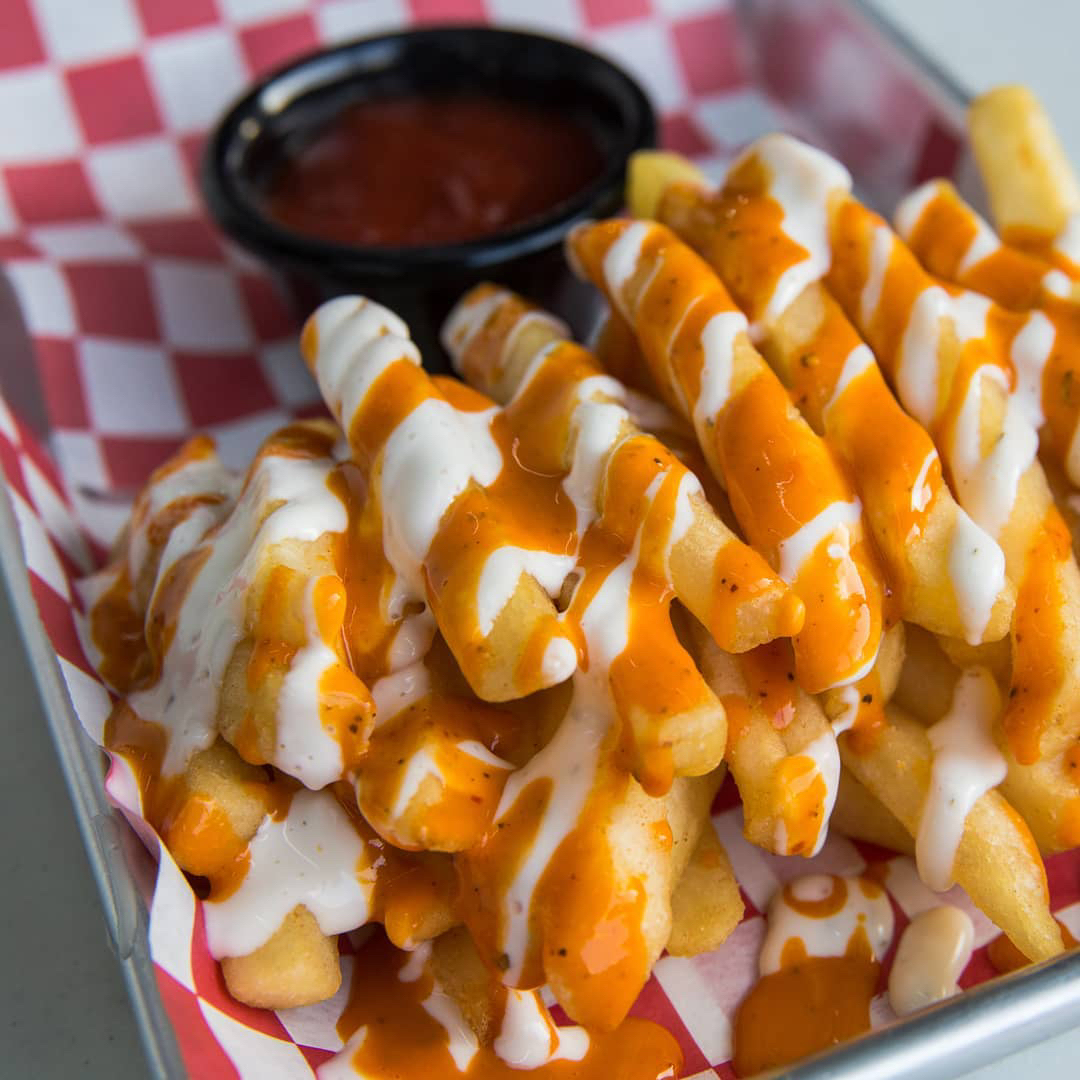 PAPITAS FRIES BAÑADAS EN ADEREZO RANCH MAS SALSA A TU ELECCIÓN (BUFALO, BBQ O MANGO HABANERO)