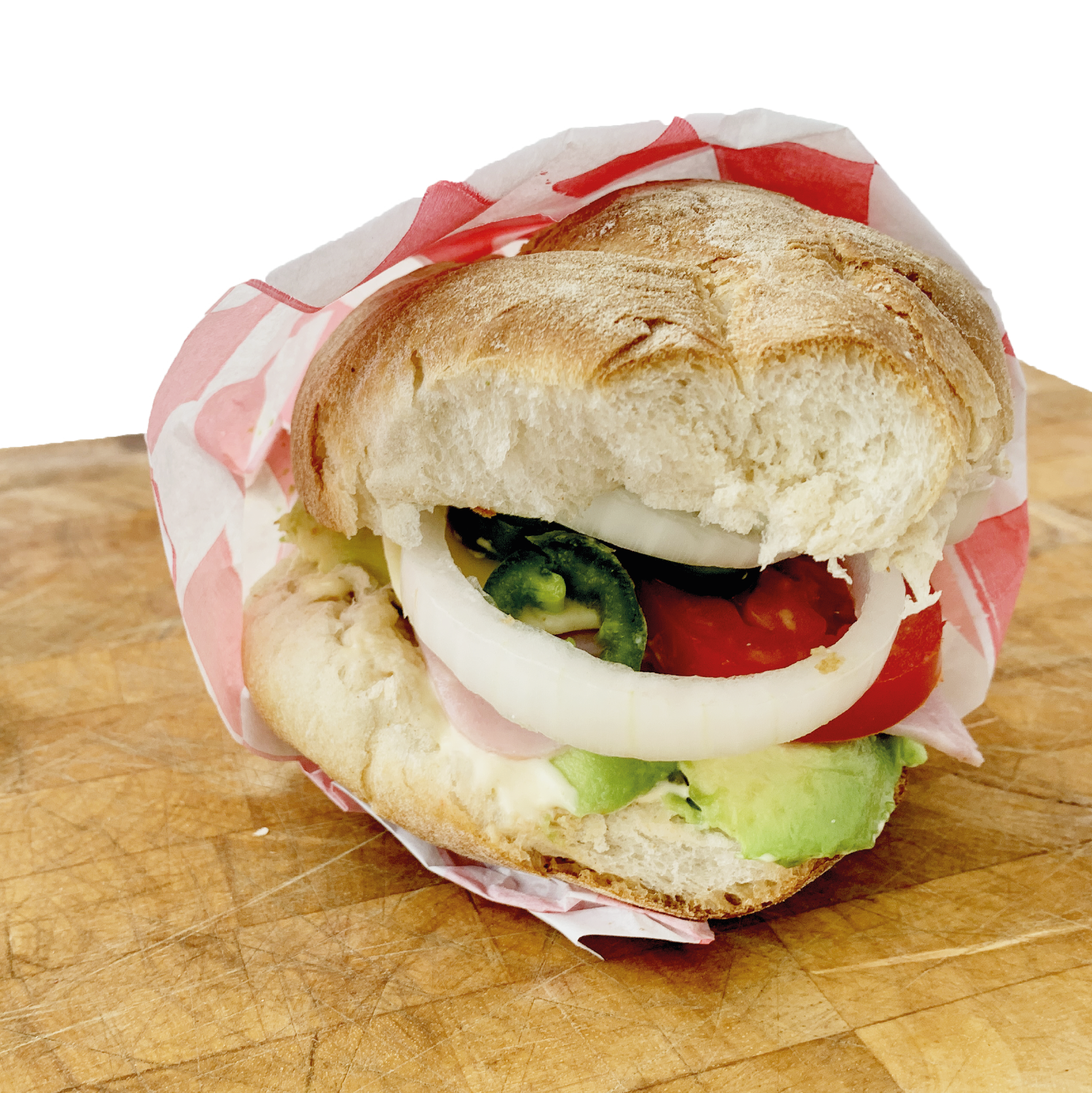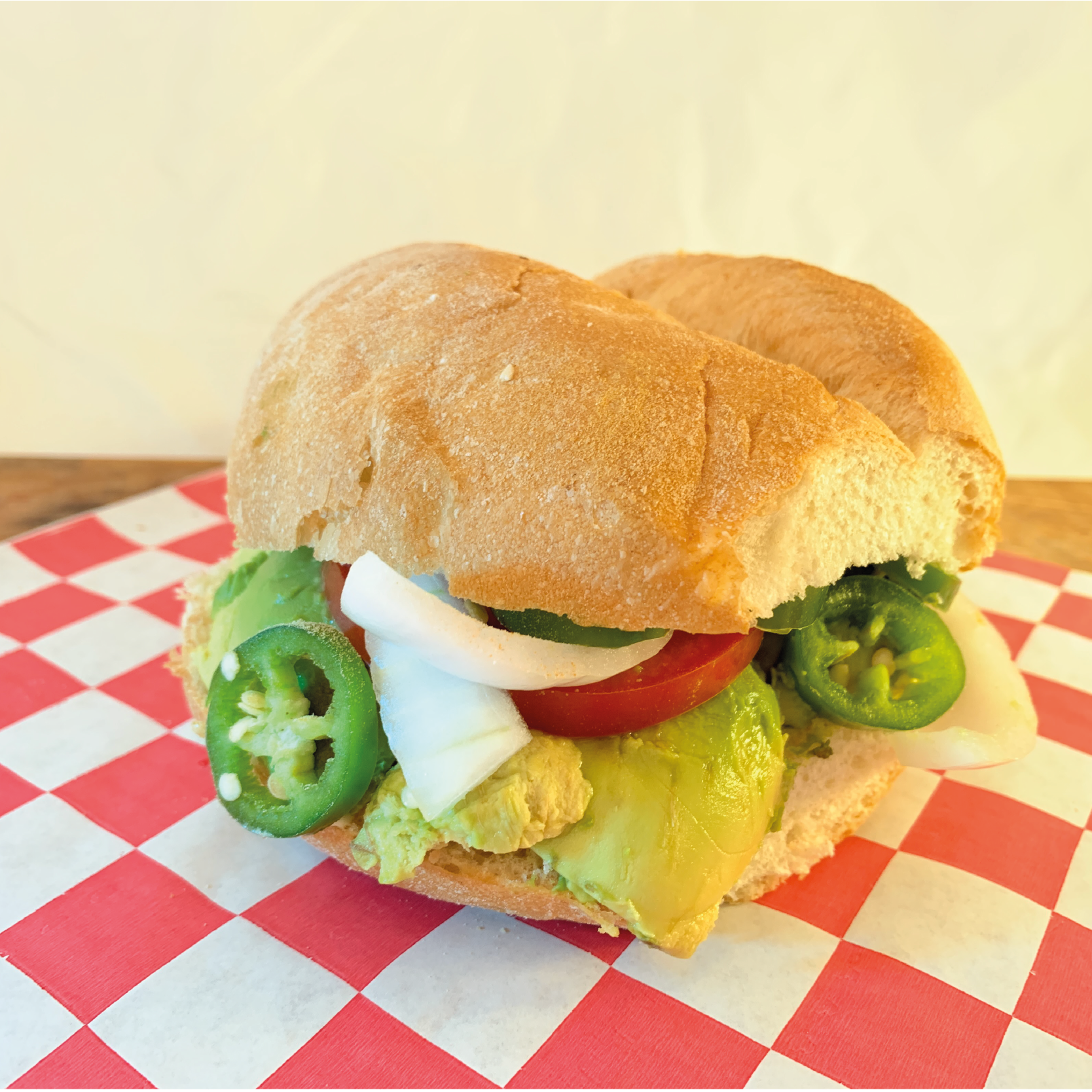 Aguacate, jamón, queso blanco, tomate, cebolla, chile jalapeño, mayonesa, mostaza.