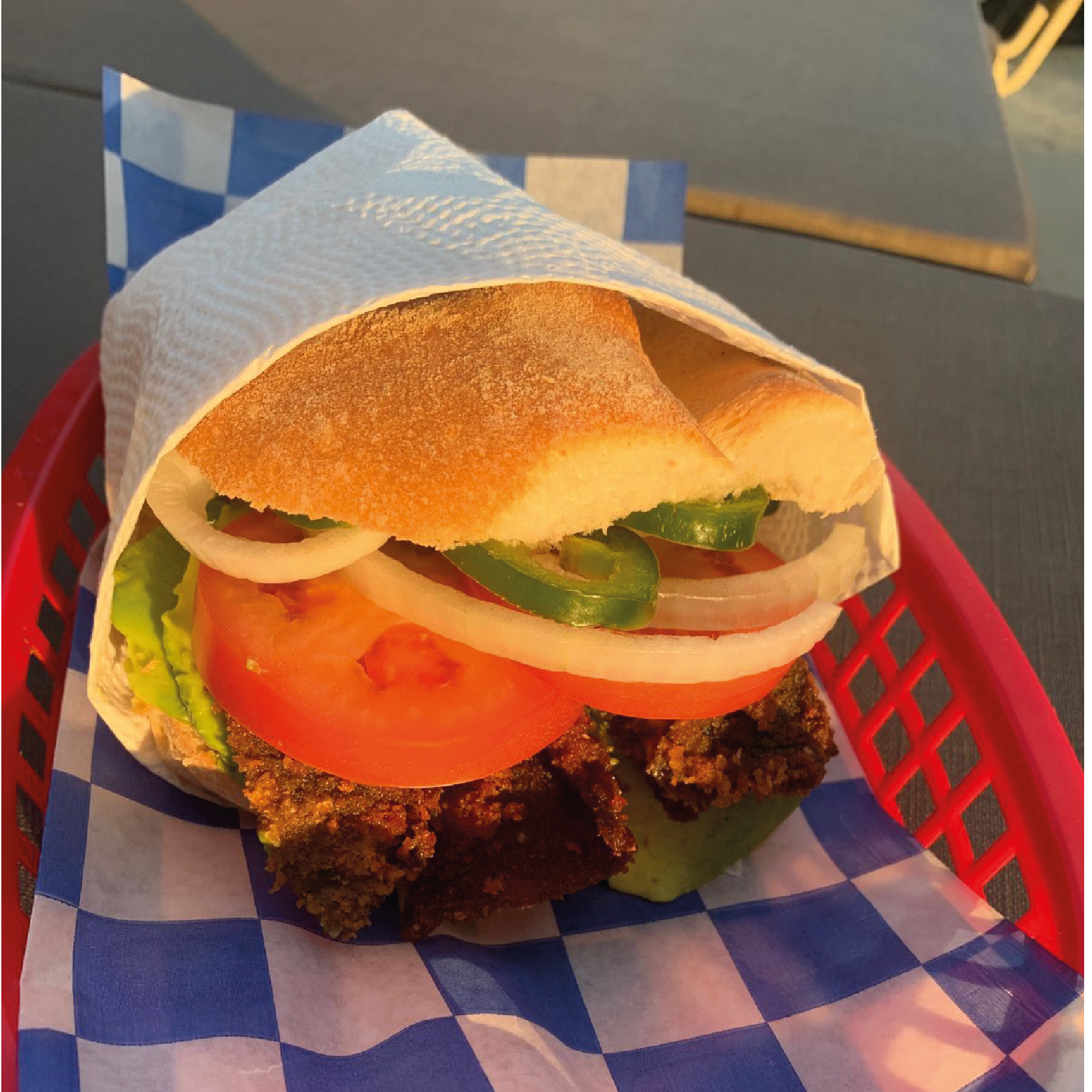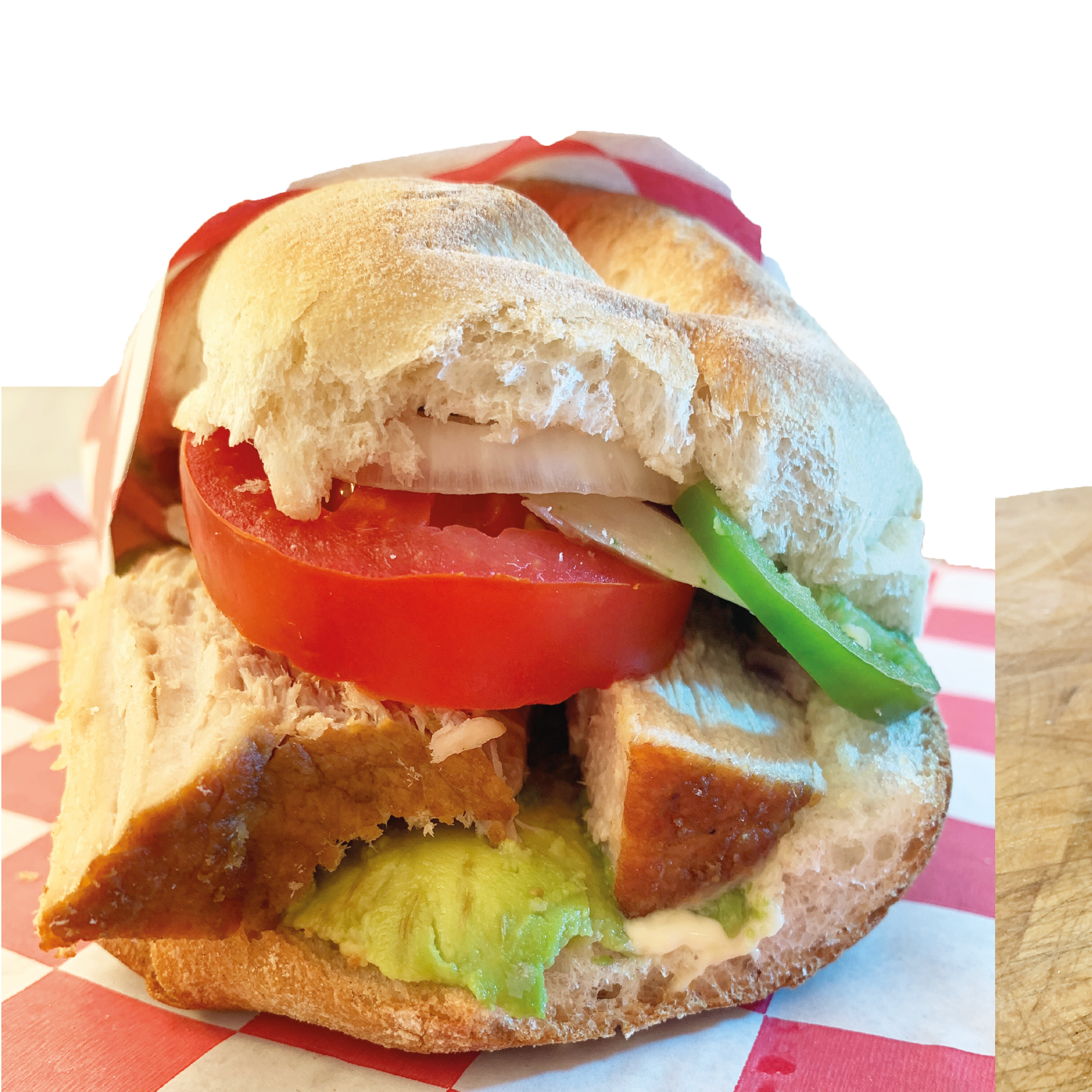 Torta de milanesa empanizada en pan francés con aguacate, tomate, cebolla, chile jalapeño, mantequilla, mostaza y mayonesa.