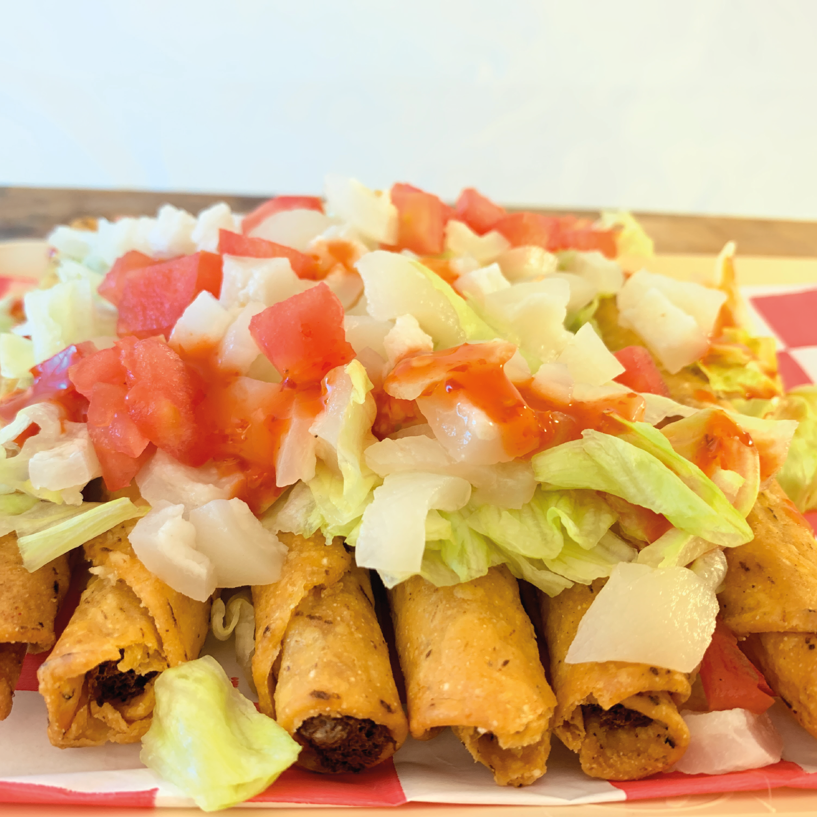 5 Taquitos de res dorados, cueritos, lechuga, tomate, cebolla, salsa roja.
