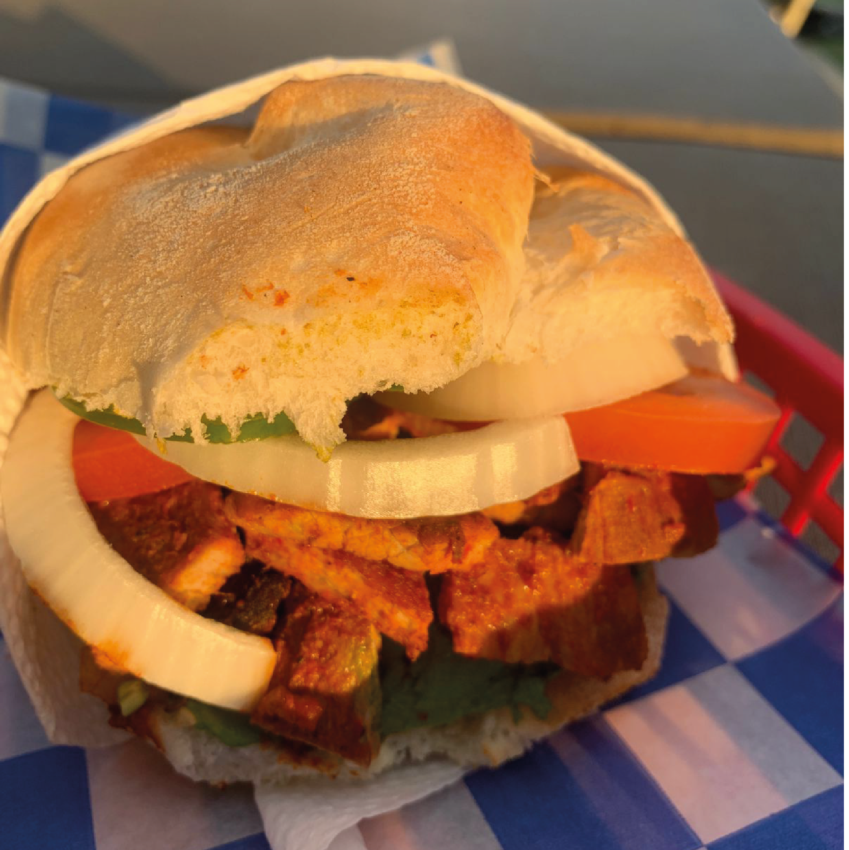 Lonche de pierna de puerco adobada en pan francés, con aguacate, tomate, cebolla, chile jalapeño, mantequilla, mayonesa y mostaza.