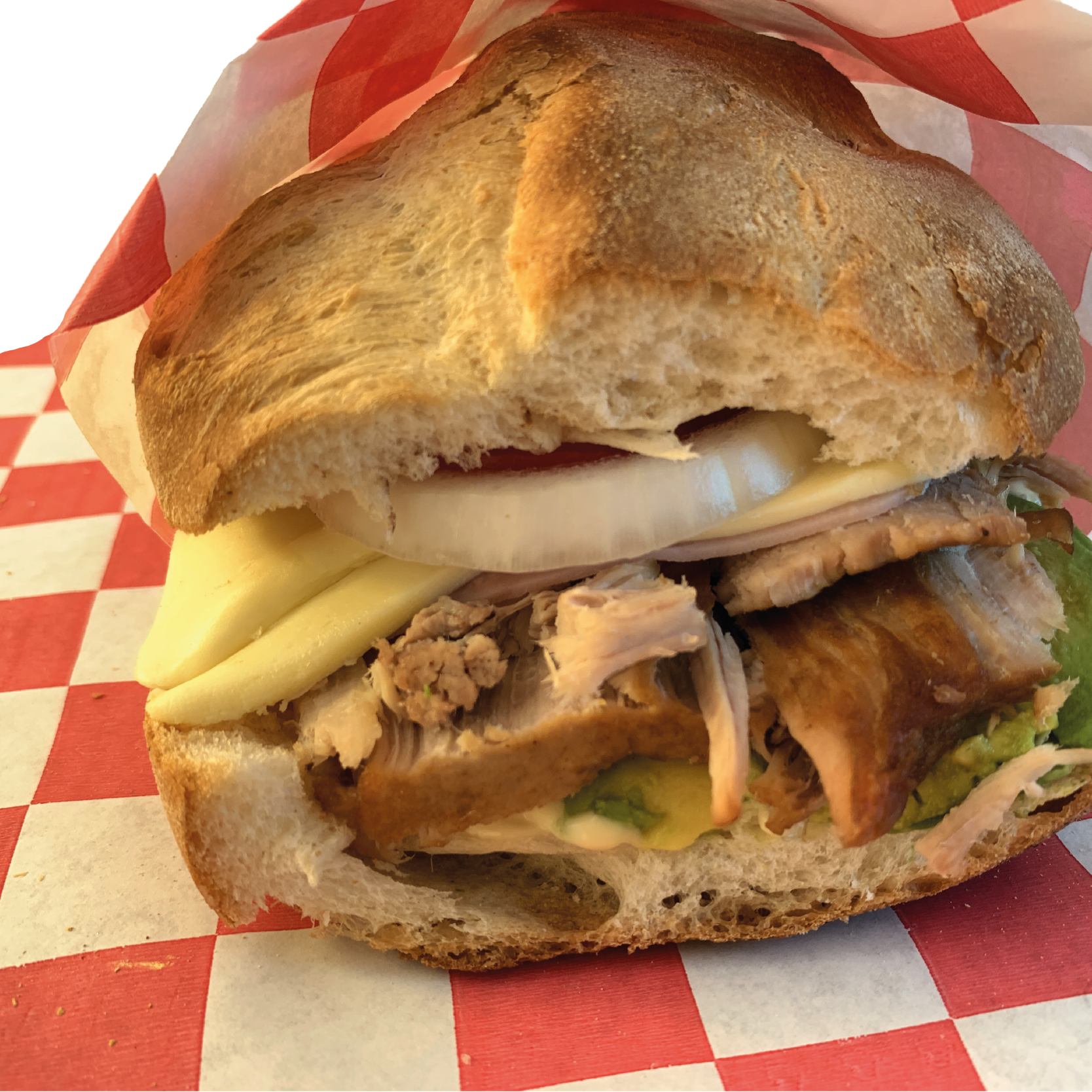 Pierna de puerco, aguacate, jamón, queso blanco, tomate, cebolla, chile jalapeño, mayonesa, mostaza.