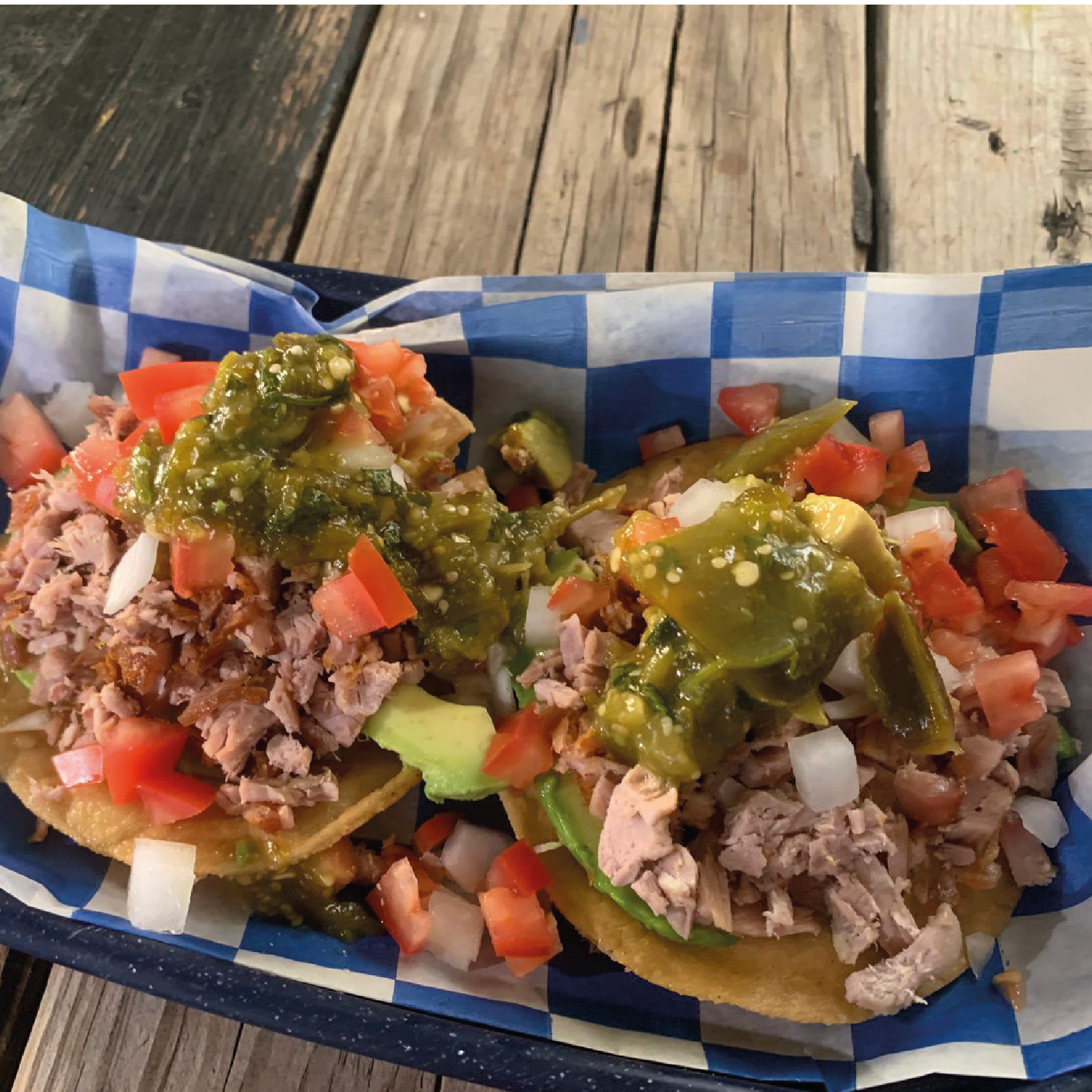 Tostadas de maíz con carnitas de pierna de puerco, aguate, chile, tomate y cebolla, salsa de tomatillo y aguacate.