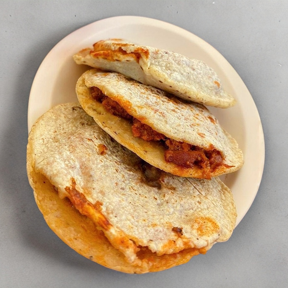 1 gordita de carne deshebrada de res con rajas y chile rojo.