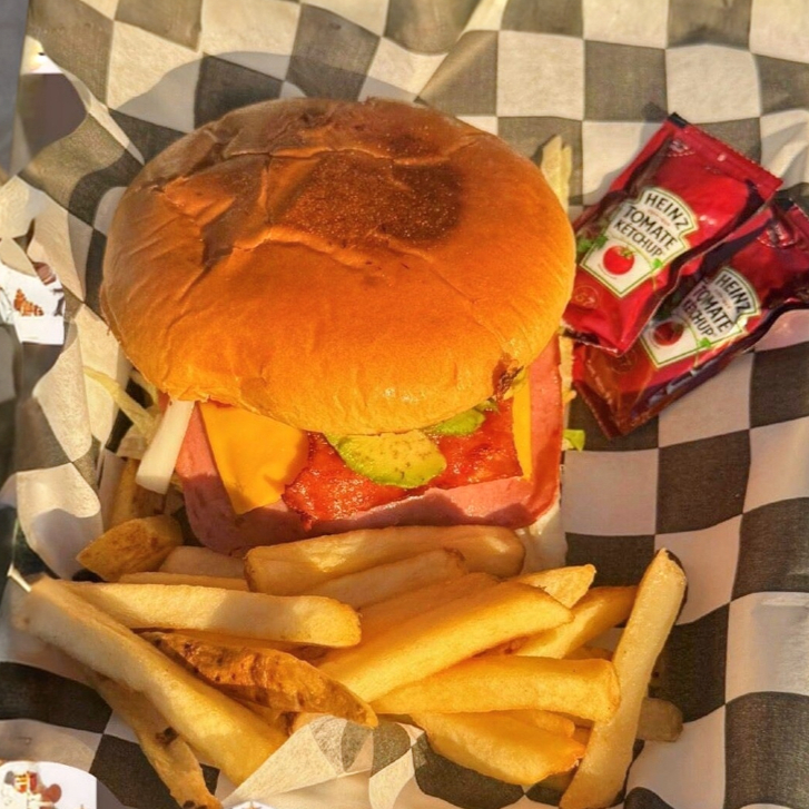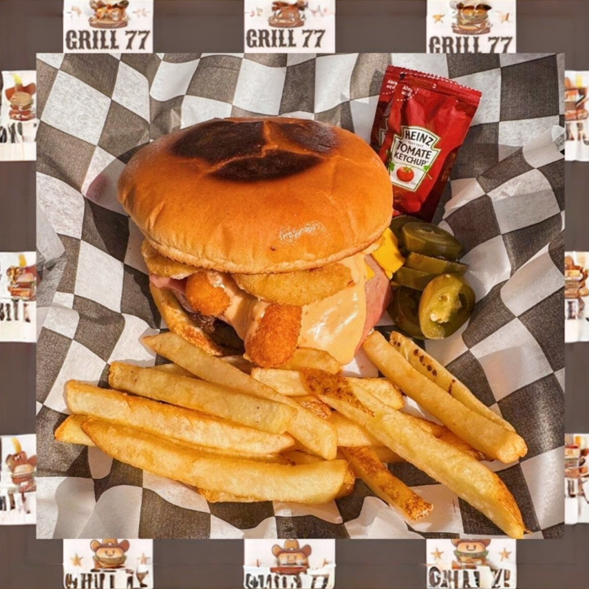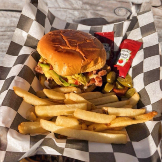 Carne de res, jamon, queso americano, tocino doradito y aguacate. Incluye porcion de papas individuales.