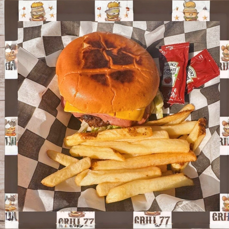 Hamburguesa clasica, con carne de res 100% casera echa con receta de la casa, pan artesanal brioche, jamon de pavo, queso amarillo, lechuga tomate y cebolla. INCLUYE PORCION DE PAPAS A LA FRANCESA!