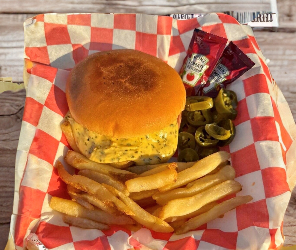 Hamburguesa con boneless, bañados en salsa bufalo, lechuga, tomate, cebolla y un toque de ranch, incluye papas a la francesa.