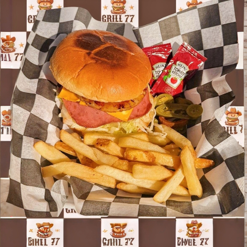 Hamburguesa con una jugosa rodaja de piña, incluye porcion de papas individuales.