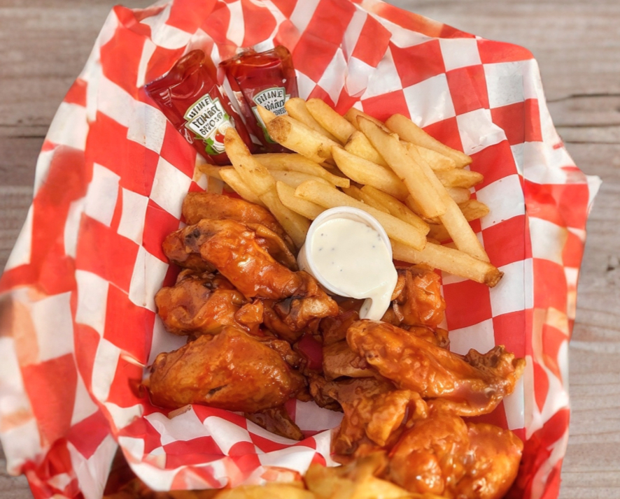 10 alitas doraditas bañadas en tu salsa favorita con papas, icluye un aderezo ranch.