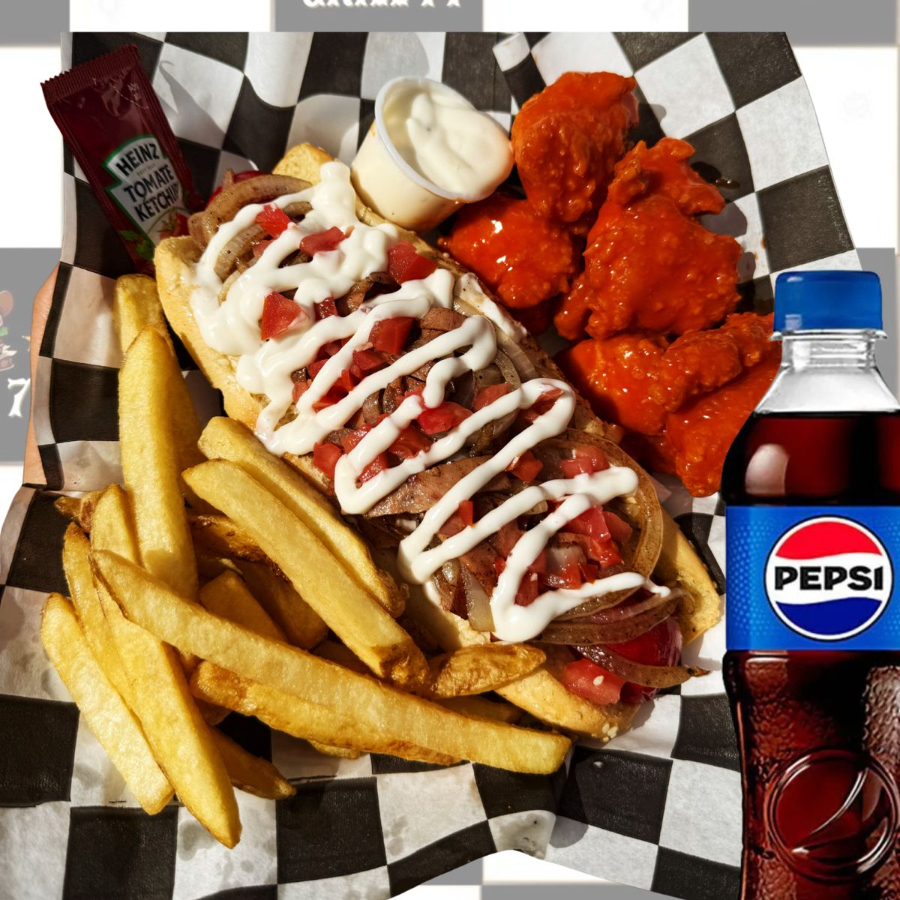 10 alitas en tu salsa favorita, incluye papas y aderezo ranch.
