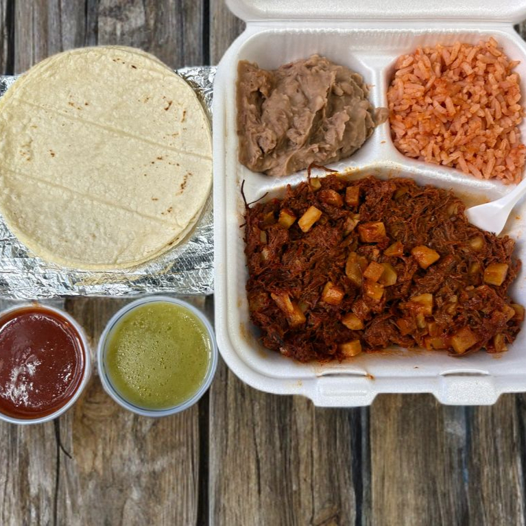 Platillo con guiso casero a elegir, acompañado de arroz y frijoles. Incluye tortillas y salsa.