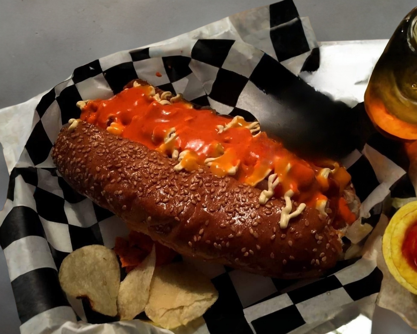 Bañado en salsa BBQ.cebolla asada y sazonada, mostaza, mayonesa, salsa BQQ. y elaborado con pan artesanal