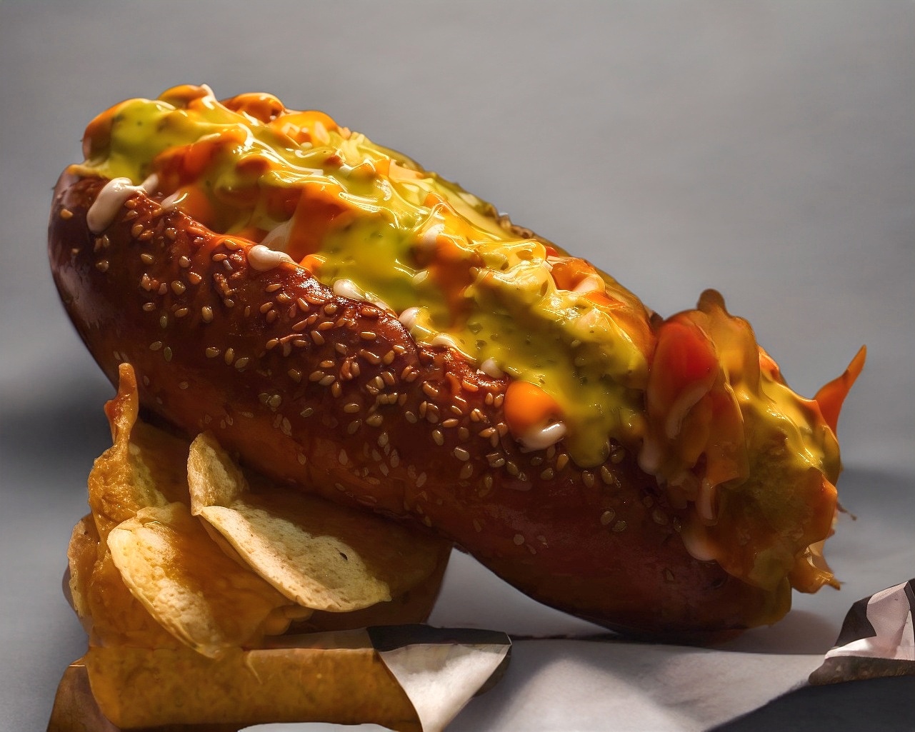 cebolla asada y sazonada, moztasa, mayonesa, queso amarillo, Guacamole picante y elaborado con pan artesanal
