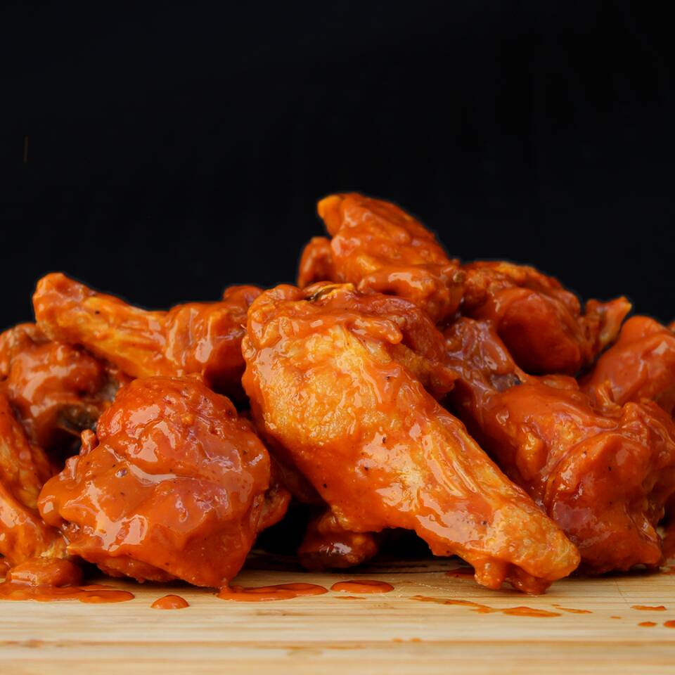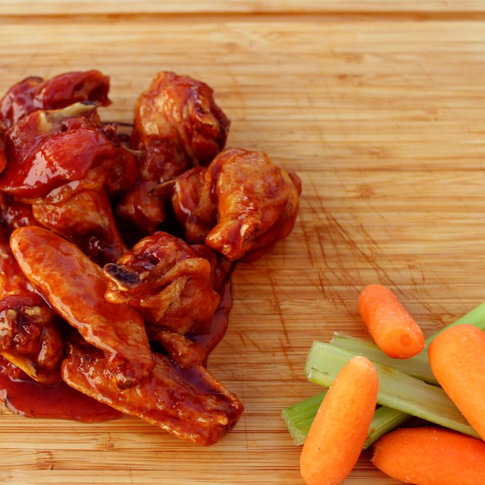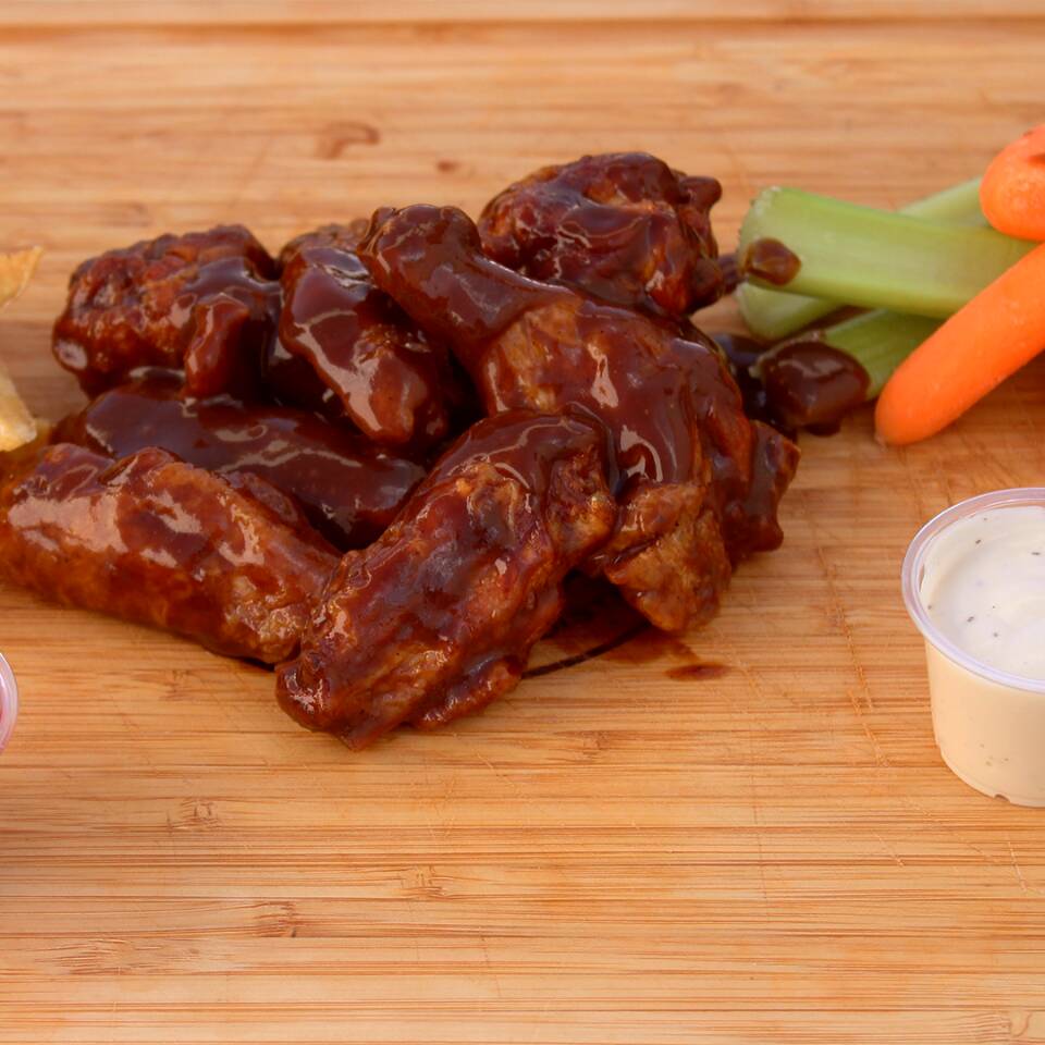 7 alitas bañadas en salsa de tu preferencia, acompañadas de zanahoria, apio y Ranch de la casa