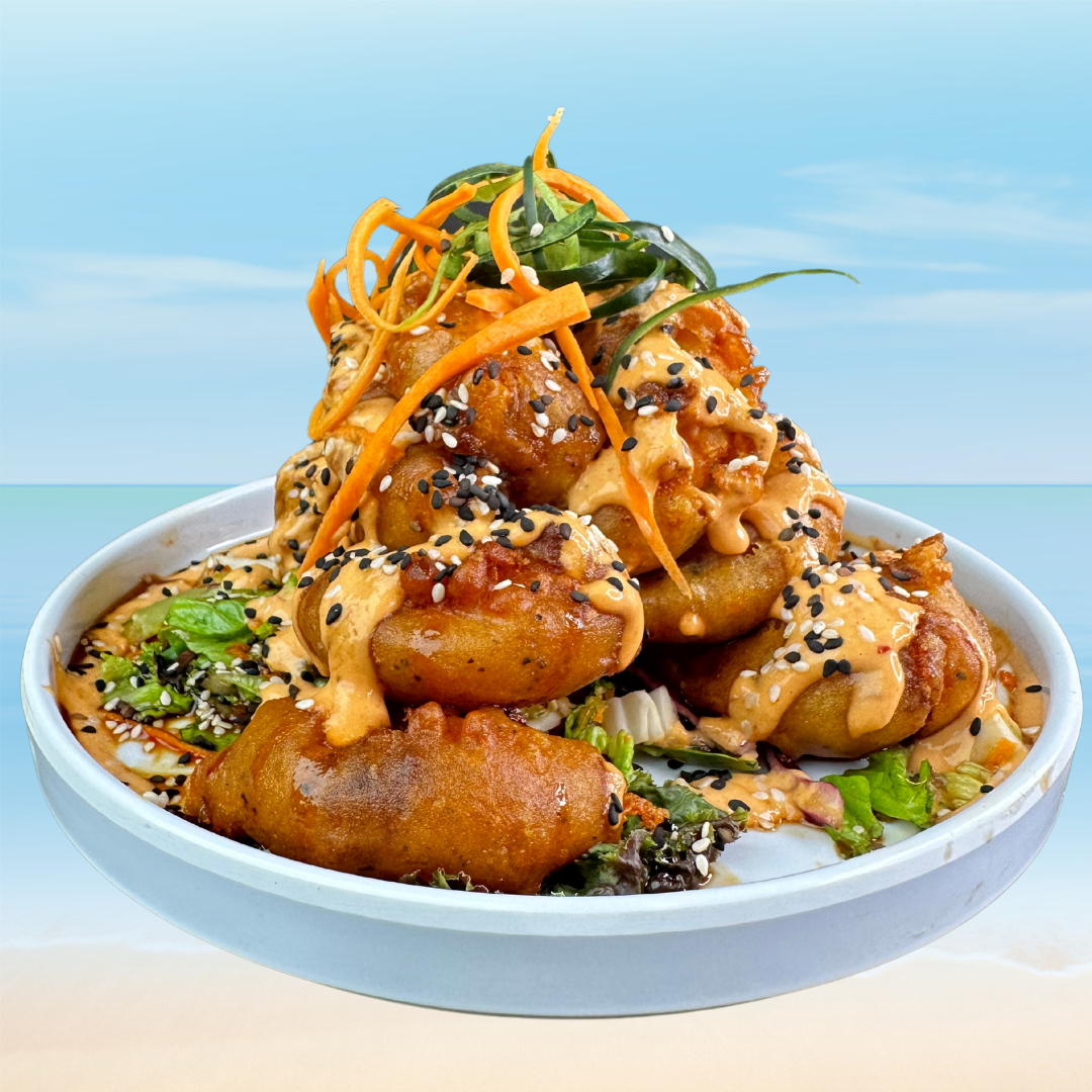 Bañada con camaron, pulpo, surimi, aros de cebolla al ajillo, arroz, ensalada y papa cambray