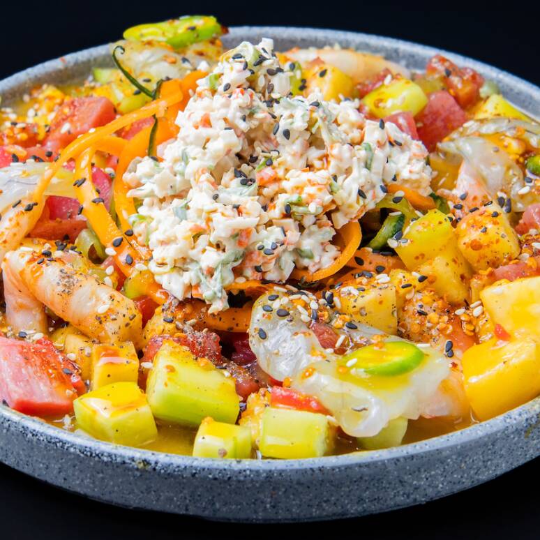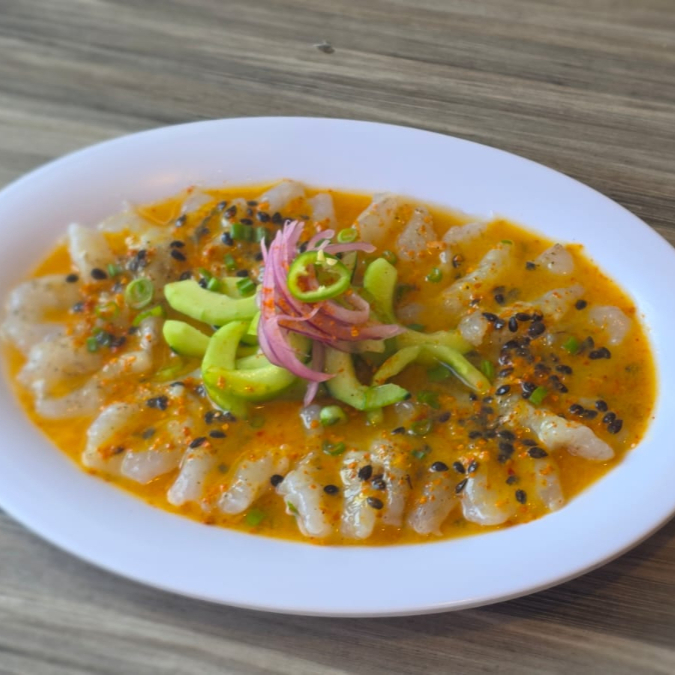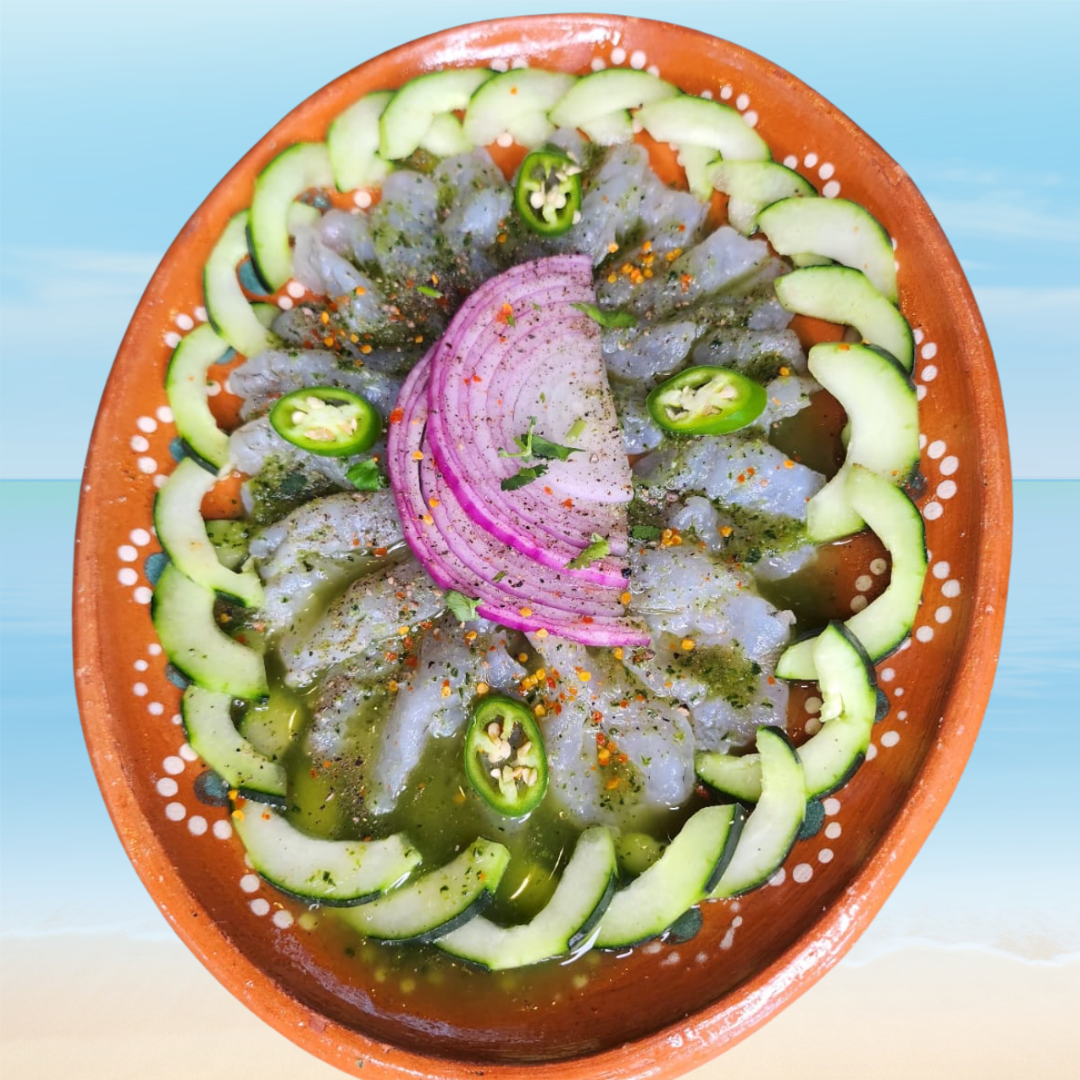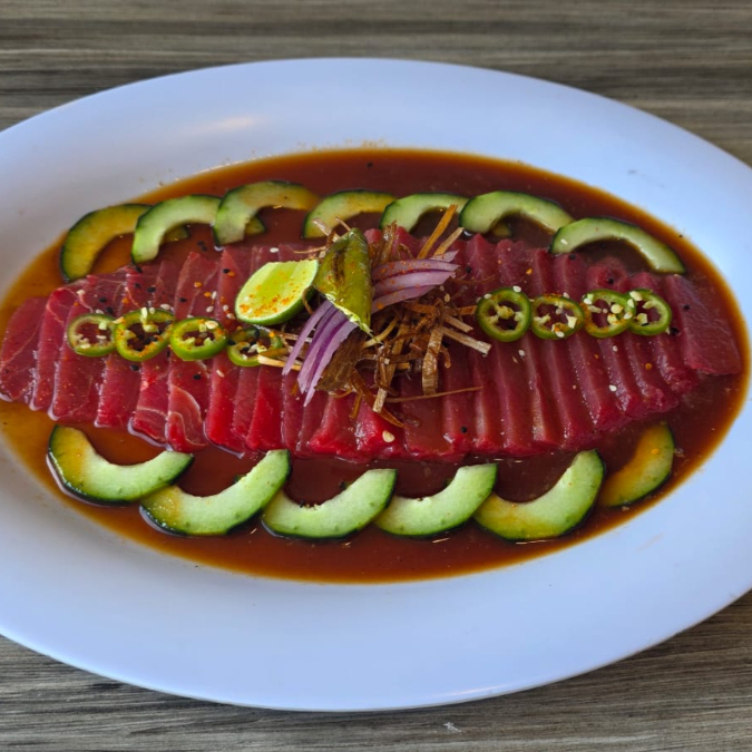 Laminas de atun, aguacate, camaron, pepino, cebolla morada, tomate y limon, bañada en salsa 90g