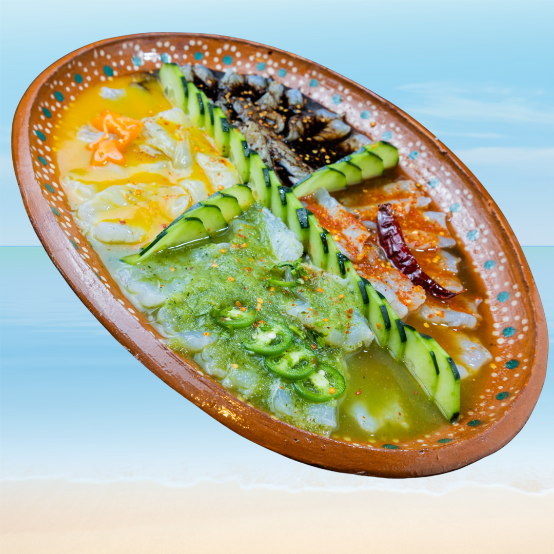 Camarón cocido, camarón aguachile, atún, Camarón cocido, camarón aguachile, atún, Camarón cocido, camarón aguachile, atún, pulpo y ceviche de pescado bañados con pulpo y ceviche de pescado bañados con pulpo y ceviche de pescado bañados con salsas negras y un camarón con cabeza salsas negras y un camarón con cabeza salsas negras y un camarón con cabeza 150g