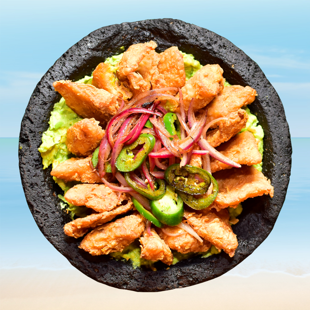 Trocitos de Pescado servidos en molcajete con guacamole 250 gr.
