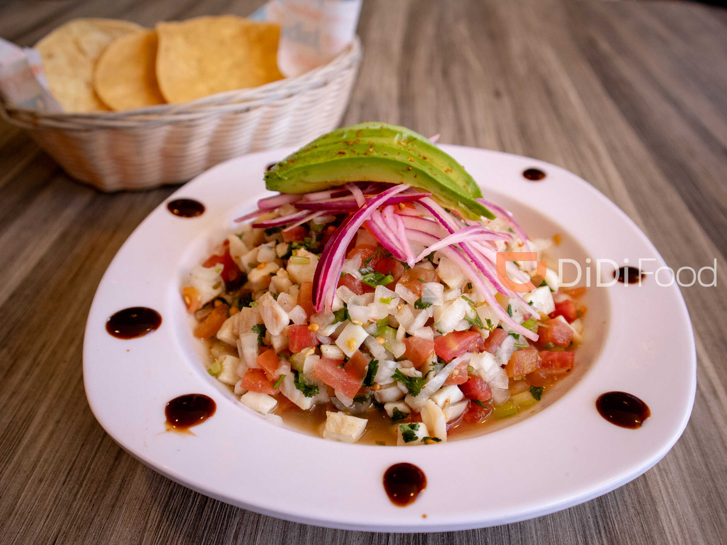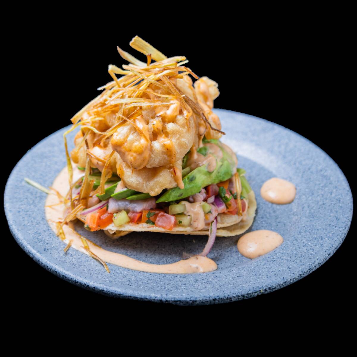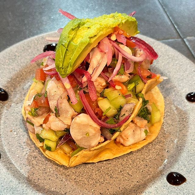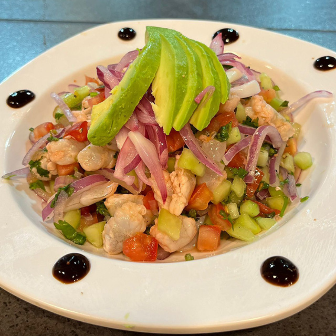 Ceviche de camaron, aguacate, coronado con camarones roca y salsa de chipotle 120g